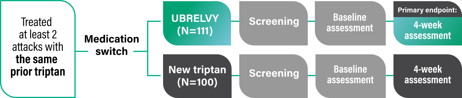 Objective: Evaluate patient-reported outcomes in participants with migraine who switched from a prior oral triptan* either to another oral triptan or to UBRELVY. Patients were followed for a period of 4 weeks and outcomes were collected via the Migraine Buddy app.5,6