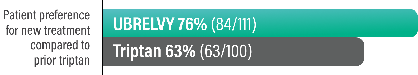Compared to your previous treatment, which medication do you prefer? (on a 5-point scale ranging from 'prefer previous triptan - I was a lot more satisfied' to 'prefer [new triptan/UBRELVY] - I am a lot more satisfied.’ Responders included those who selected 'prefer [new triptan/UBRELVY] - I am a lot more satisfied or I am a little more satisfied.')6