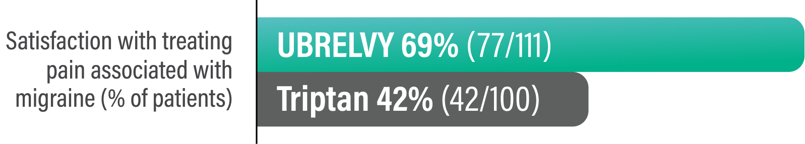 Overall, how satisfied are you with your UBRELVY/Triptan for treating pain associated with your migraine? (on a 7-point Likert scale ranging from 'extremely satisfied' to 'extremely dissatisfied.' Responders included those who selected 'extremely satisfied' or 'satisfied.')6